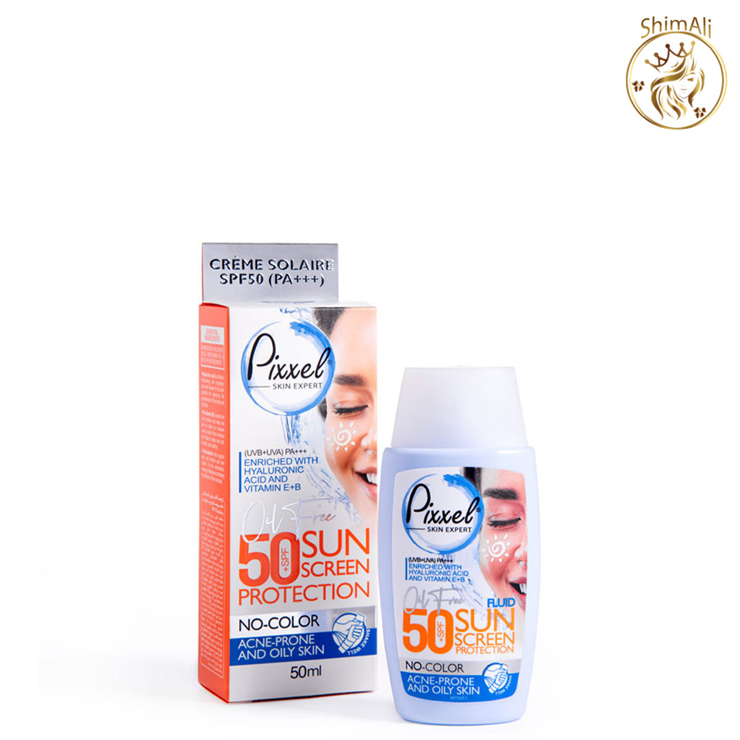 • کرم ضدآفتاب فلوئیدی بی‌رنگ پیکسل مناسب پوست‌های چرب و جوش‌دار